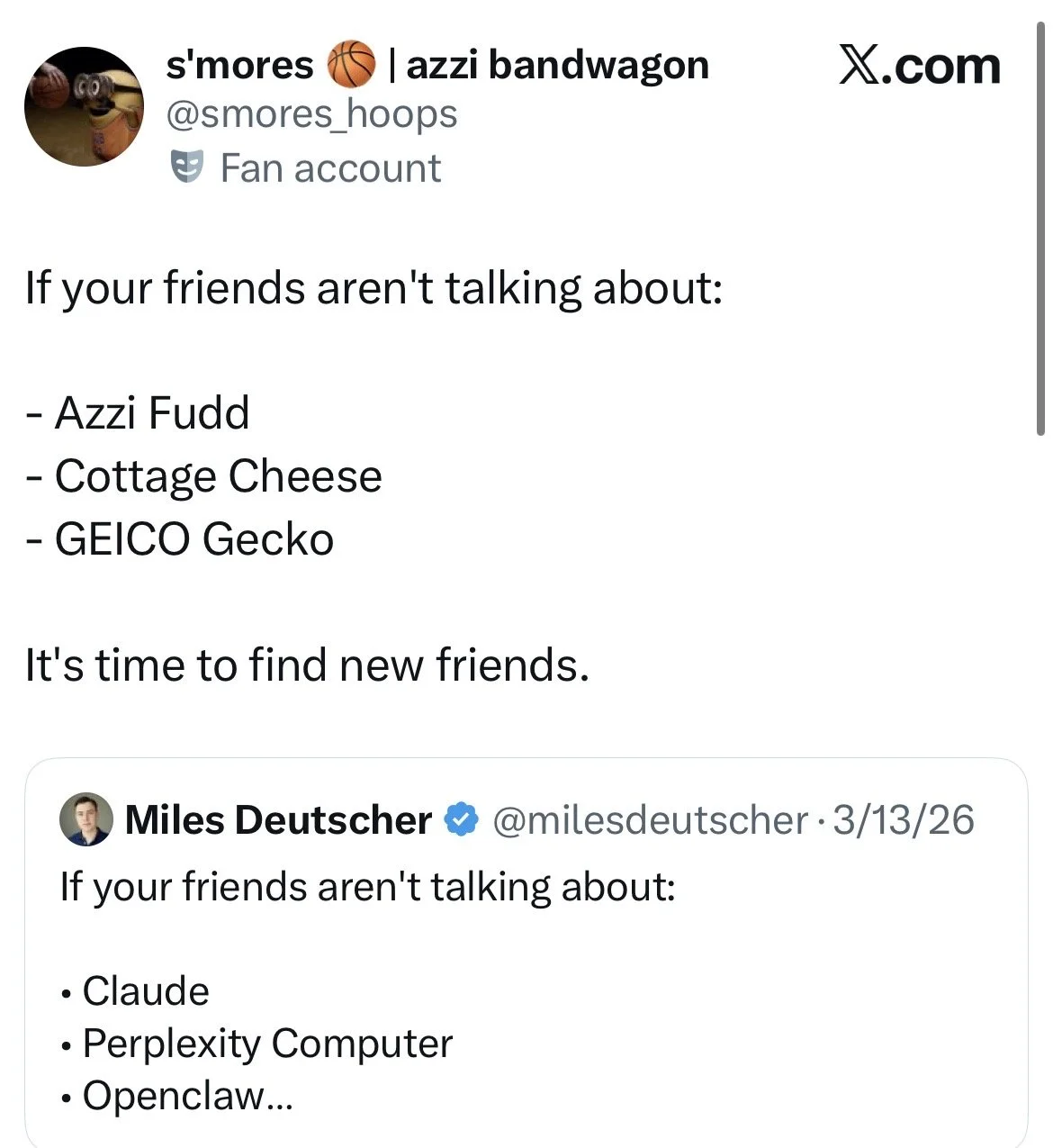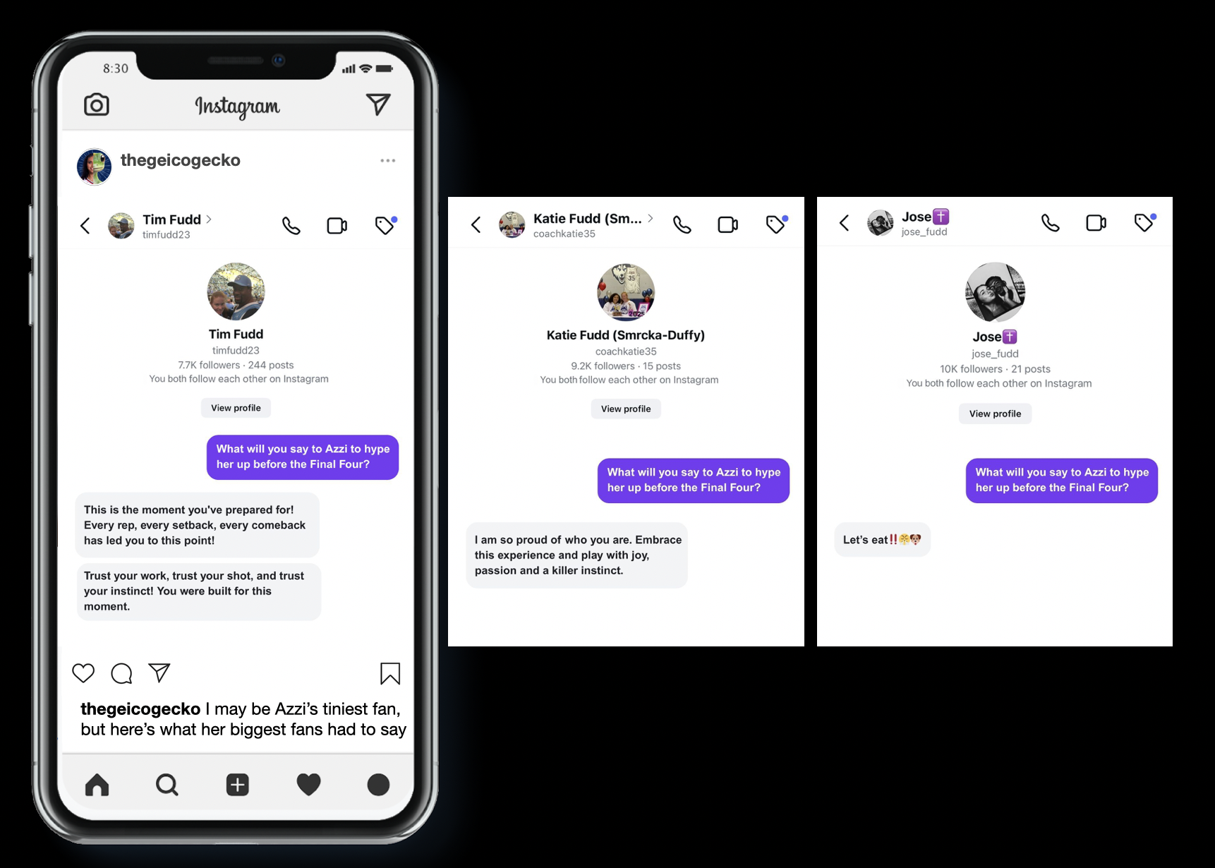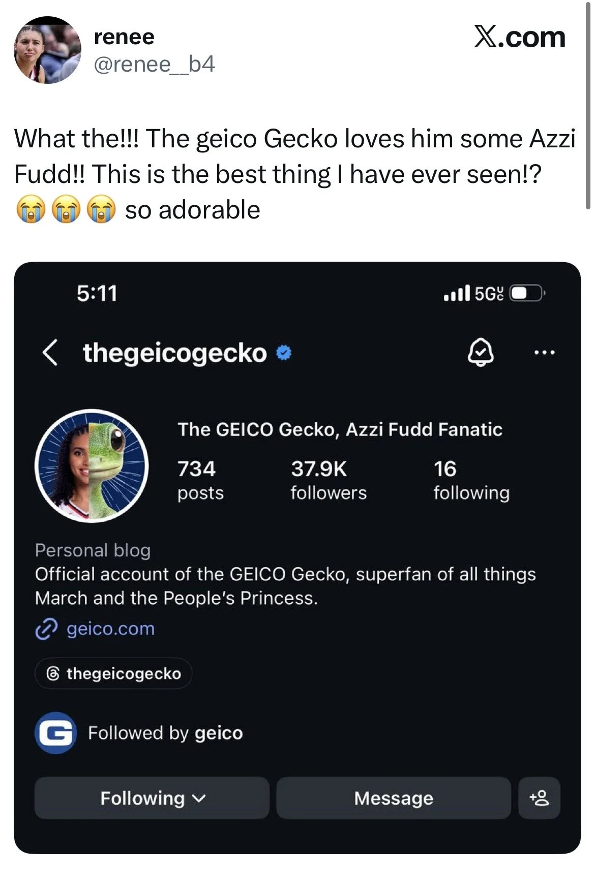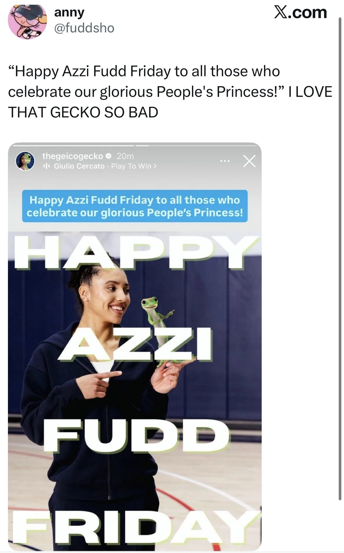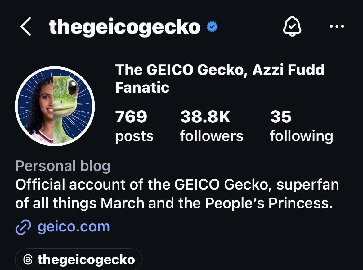 So during March Madness, we turned the Gecko’s social profile into an Azzi Fudd fan account.